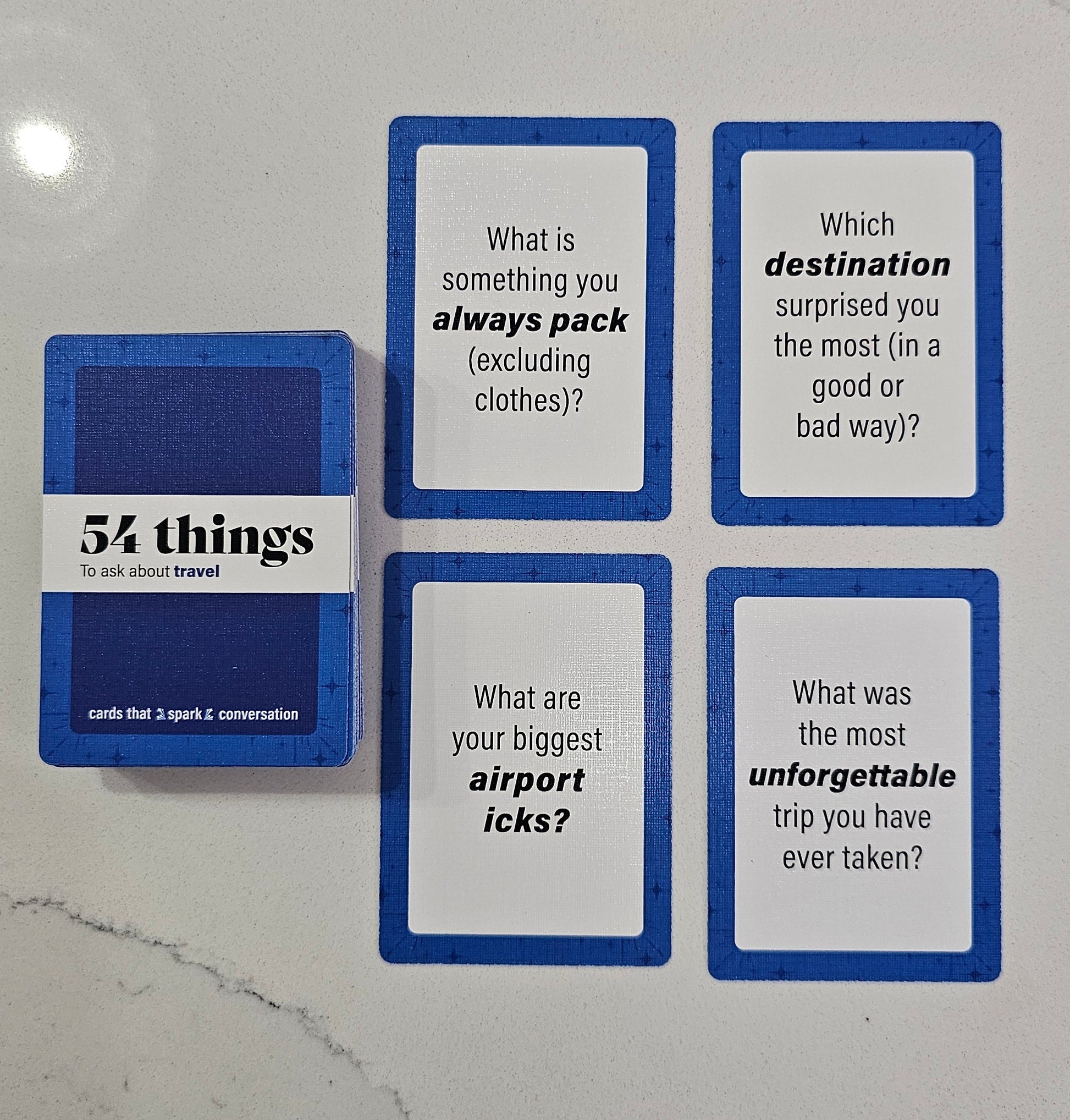 Whether you're a seasoned traveller or just love hearing travel stories, 54 Things to ask about travel is the perfect conversation deck to spark exciting discussions about our wonderful world! Featuring 54 wanderlust-inspiring questions, this deck helps uncover amazing experiences, dream destinations, and unique cultural insights.